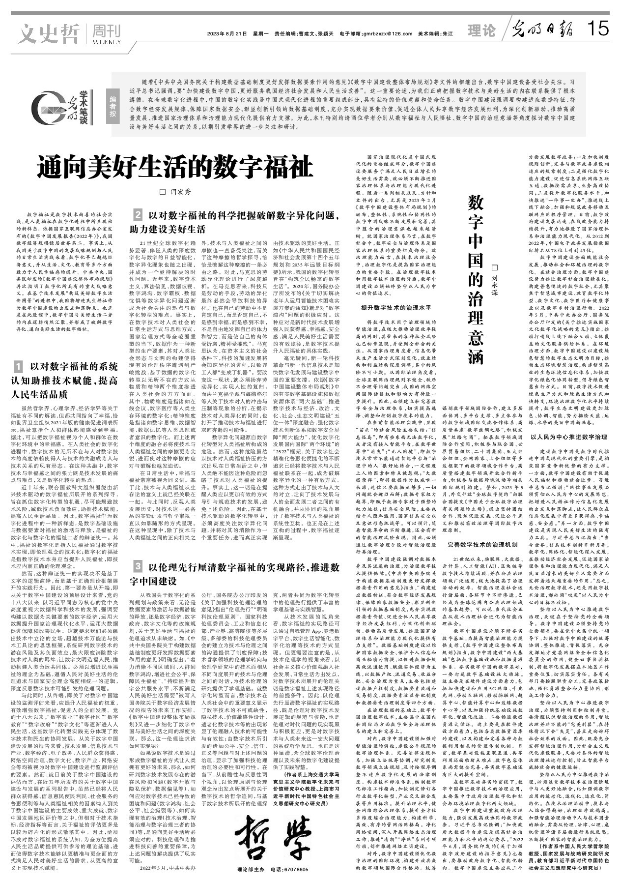 随着《中共中央国务院关于构建数据基础制度更好发挥数据要素作用的意见》《数字中国建设整体布局规划》等文件的相继出台,数字中国建设备受社会关注。习近平总书记强调,要“加快建设数字中国,更好服务我国经济社会发展和人民生活改善”。这一重要论述,为我们正确把握数字技术与美好生活的内在联系提供了根本遵循。在全球数字化进程中,中国的数字化实践是中国式现代化进程的重要组成部分,具有独特的价值意蕴和使命任务。数字中国建设强调要构建适应数据特征、符合数字经济发展规律、保障国家数据安全、彰显创新引领的数据基础制度,充分实现数据要素价值、促进全体人民共享数字经济发展红利,为深化创新驱动、推动高质量发展、推进国家治理体系和治理能力现代化提供有力支撑。为此,本刊特别约请两位学者分别从数字福祉与人民福祉、数字中国的治理意涵等角度探讨数字中国建设与美好生活之间的关系,以期引发学界的进一步关注和研讨。