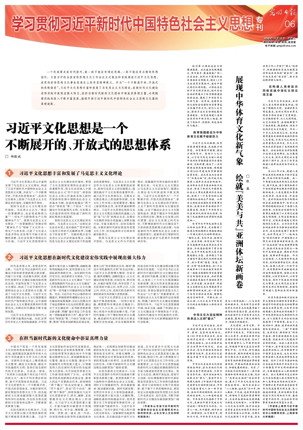 习近平总书记指出,亚洲是人类文明的重要发祥地,创造了璀璨的文明。追溯世界文明发展史,亚洲文明为世界文明的多样性贡献了宝贵财富,从宗教到哲学、从人文到科技、从艺术到体育,各领域都留下了独具特色、精湛绝伦、传承不朽的历史与文化瑰宝。作为一个多元文化的交汇体,亚洲各国有着各自独特的地域风情和人文景观,不同文化之间的交流有着悠久的历史,多元文化的共生共存造就了亚洲独有的魅力。亚运会既是亚洲各国展示运动之美的舞台,也为展现人文之美、深化文明交流互鉴提供广阔平台,显示了体育在构建人类命运共同体中的巨大价值。