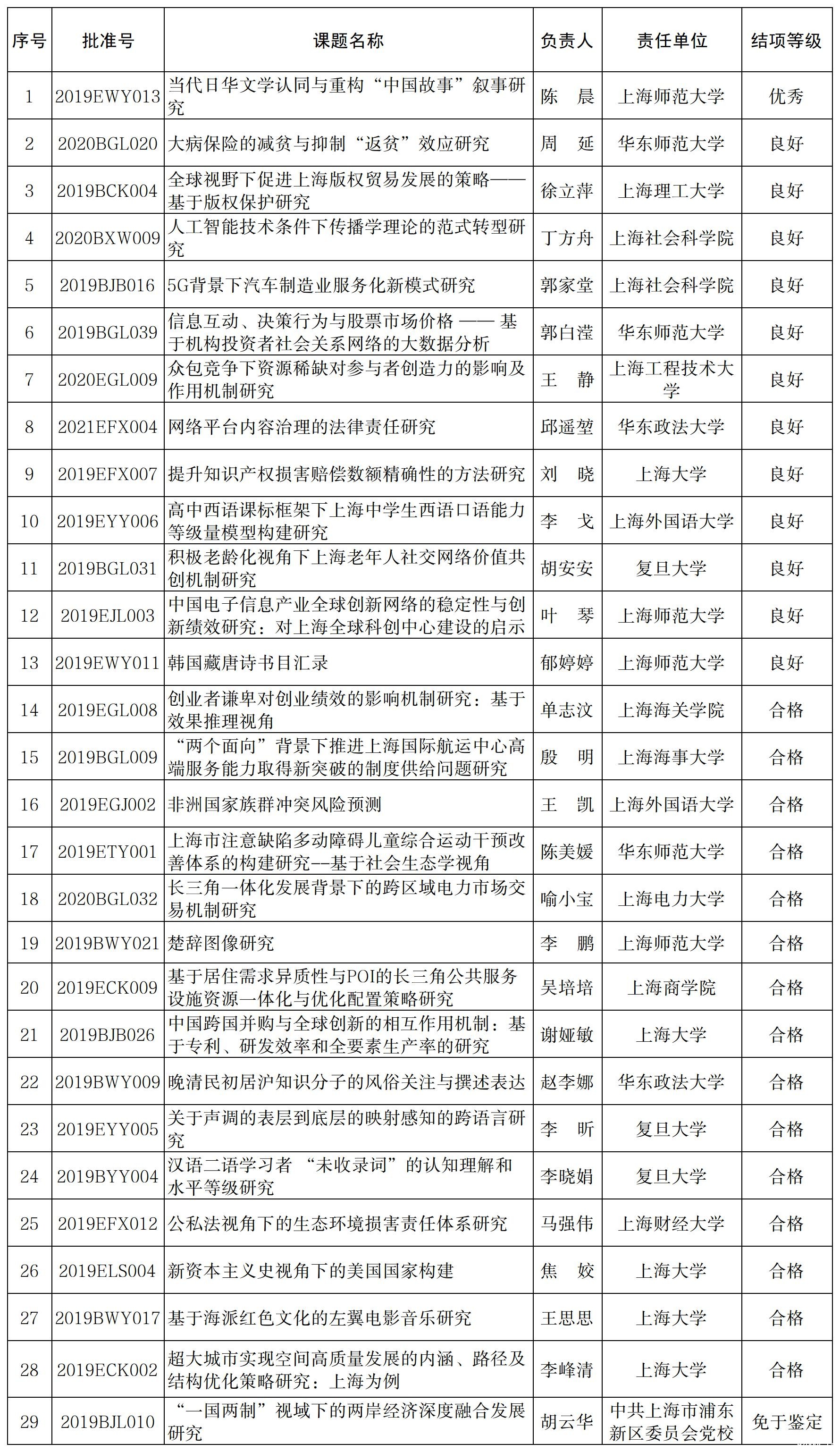 2024年5月,市社科规划办共办理34项课题结项申请。经专家鉴定,29项课题通过结项。现将结项情况公布如下: