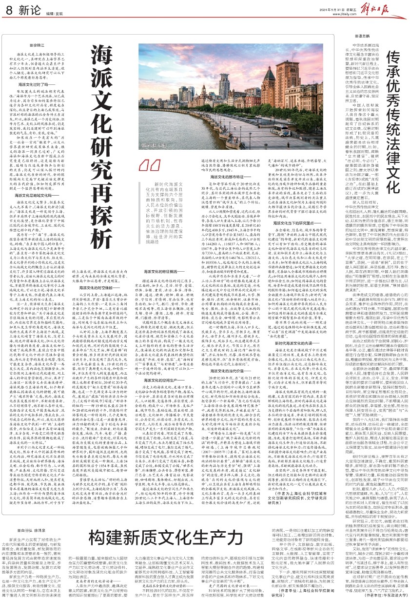 将不限于此的问题一一研究清楚,通过创造性转化和创新性发展,就可以在“历史渊源”中发现海派文化的“当代意蕴”。
