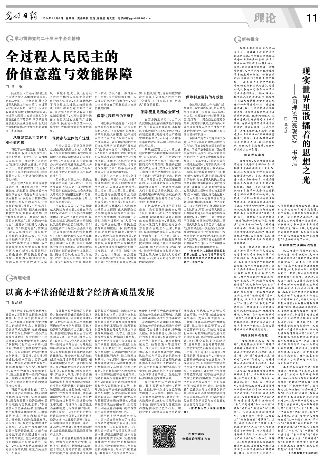 民主是全人类的共同价值,是中国共产党人不懈的价值追求。党的二十届三中全会提出“健全全过程人民民主制度体系”。全过程人民民主不仅是一种理念,而且是有着系统制度支撑的现实实践。全过程人民民主的提出及其在中国制度体系下的展开,不仅承继马克思主义民主观价值内核,也为民主效能的发挥、民主精义的彰显提供了多重保障。