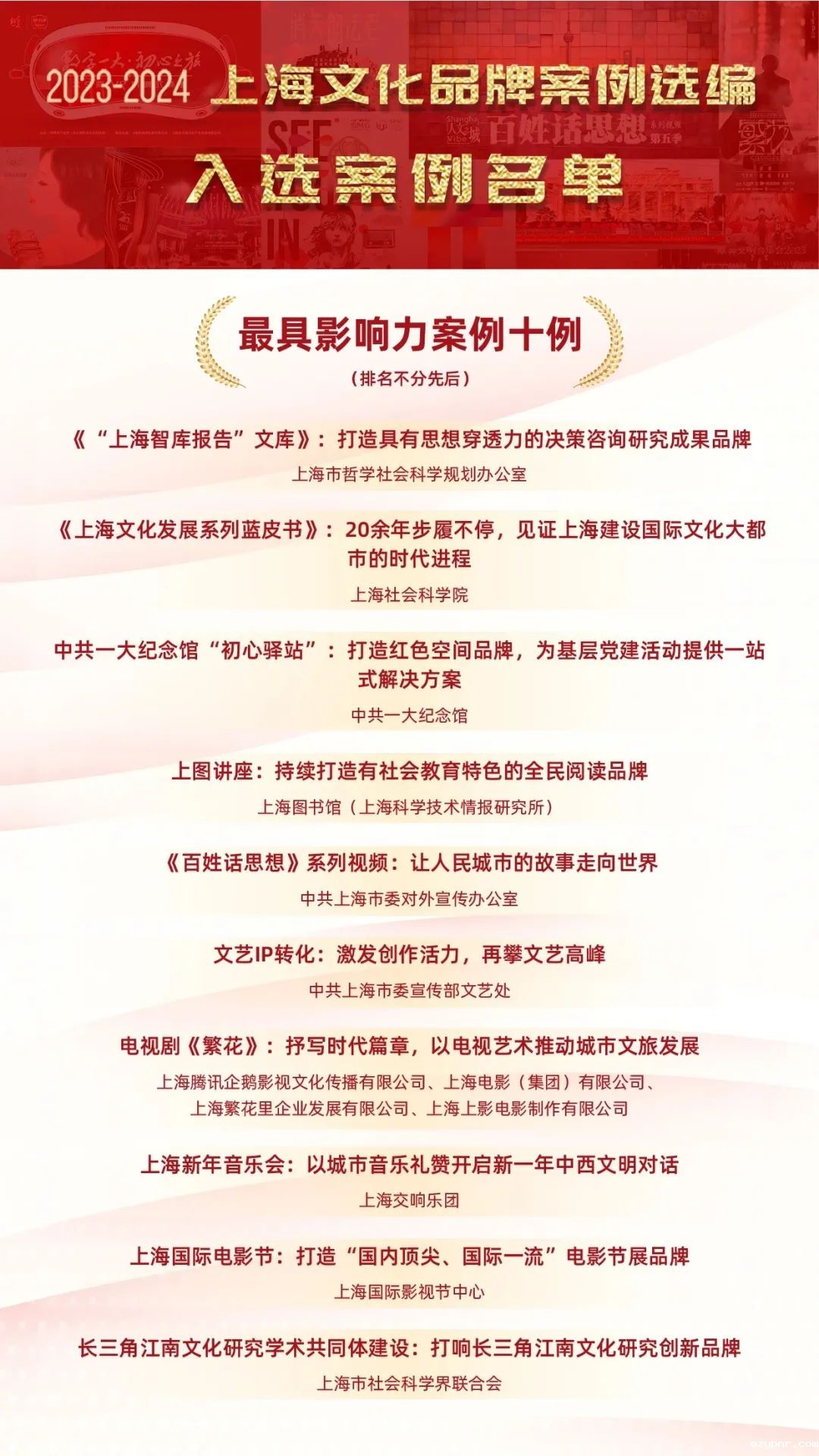据悉,此次案例选编以打造具有世界影响力的上海文化品牌为着力点,以深入落实《上海市建设习近平文化思想最佳实践地行动方案》9大行动、30项重点工程为脉络,围绕影响力、创新性、市民欢迎、融合发展、海外传播等五个维度,推选出2023-2024上海文化品牌最具影响力案例十例、最佳创新发展案例十例、最受市民欢迎案例十例、最佳融合发展案例十例和最佳海外传播案例十例。