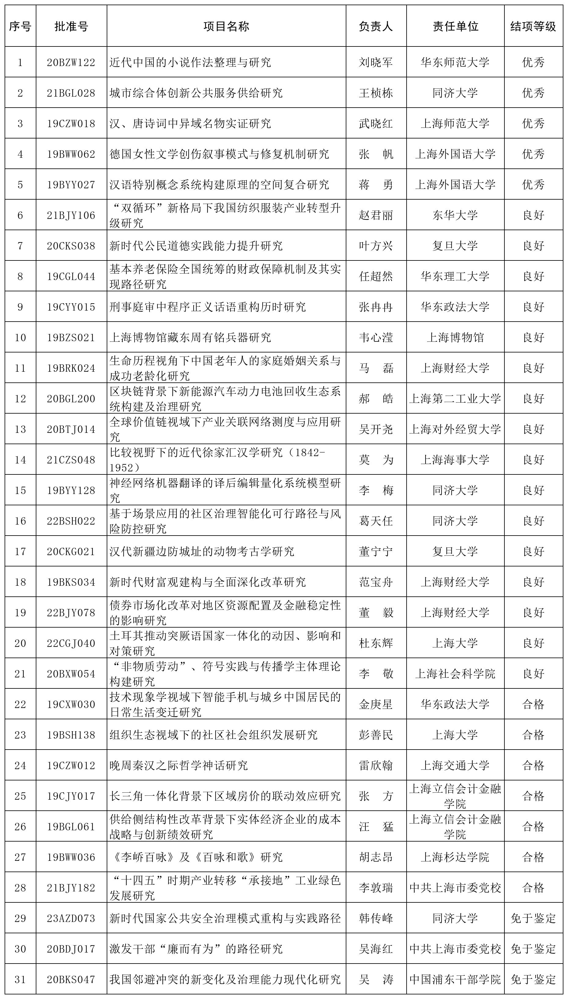 2025年8月,全国社科工作办验收453个年度项目、青年项目和西部项目结项申请。经专家鉴定,我市31个项目通过结项。现将结项情况公布如下:
