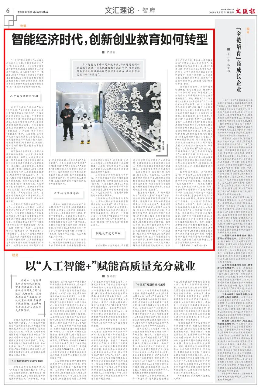 政府工作报告已经连续3年对“人工智能+”作出部署,今年首次提出要“打造智能经济新形态”。从传统制造到智能制造,从单一产业发展到链式协同升级,智能经济正打破行业边界,成为培育新质生产力、推动高质量发展的核心引擎。人工智能推动经济形态加快从“规模经济”转向“智能经济”,“产业链”竞争也转向“创新生态”竞争。从长期看,技术变革既会扩大对高技能人才的需求,也会通过劳动生产率提高与收入效应,拓展消费场景,培育新产业、新岗位,进而对高校创新创业教育改革提出新的任务。